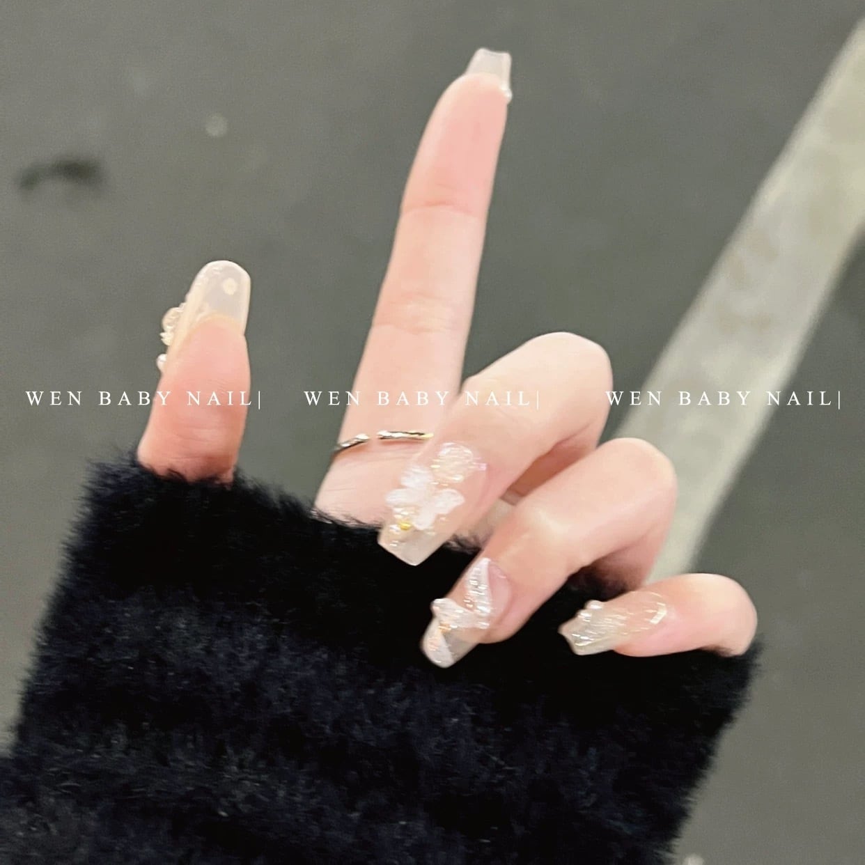 - デザイン: 透明なネイルチップ、花模様の装飾